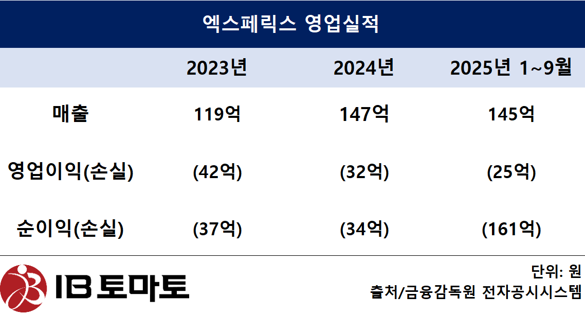 엑스페릭스는 최근 몇 년간 매출은 성장했지만 적자 구조를 벗어나지 못하고 있다. 2023년 매출 119억원에서 2024년 147억원으로 증가했고, 2025년 1~9월에도 145억원을 기록했다. 반면 영업손실은 같은 기간 42억원, 32억원, 25억원으로 적자가 지속됐다. 이로 인해 지난해 9월 말 기준 결손금은 97억원까지 누적됐다.