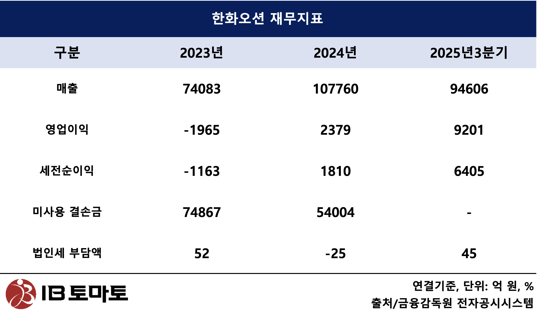 2023년 한화오션은 대우조선해양의 미사용 결손금 7조4867억원을 물려 받았다. 다음해 말 한화오션의 미사용 결손금은 5조4004억원으로 크게 줄었다. 미사용 결손금 축소 회계처리를 한 것은 1년 사이 조선업황 개선에 따라 향후 이익 발생 가능성이 높아졌다고 판단했기 때문으로 풀이된다. 축소된 미사용 결손금 중 법인세 공제에 활용된 결손금이 포함된 것으로 파악된다.