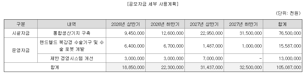 운영 자금은 핸드헬드 복강경 수술기구와 수술 로봇 개발, 제반 경영시스템 개선에 오는 2027년 하반기까지 예산을 집행키로 했다.