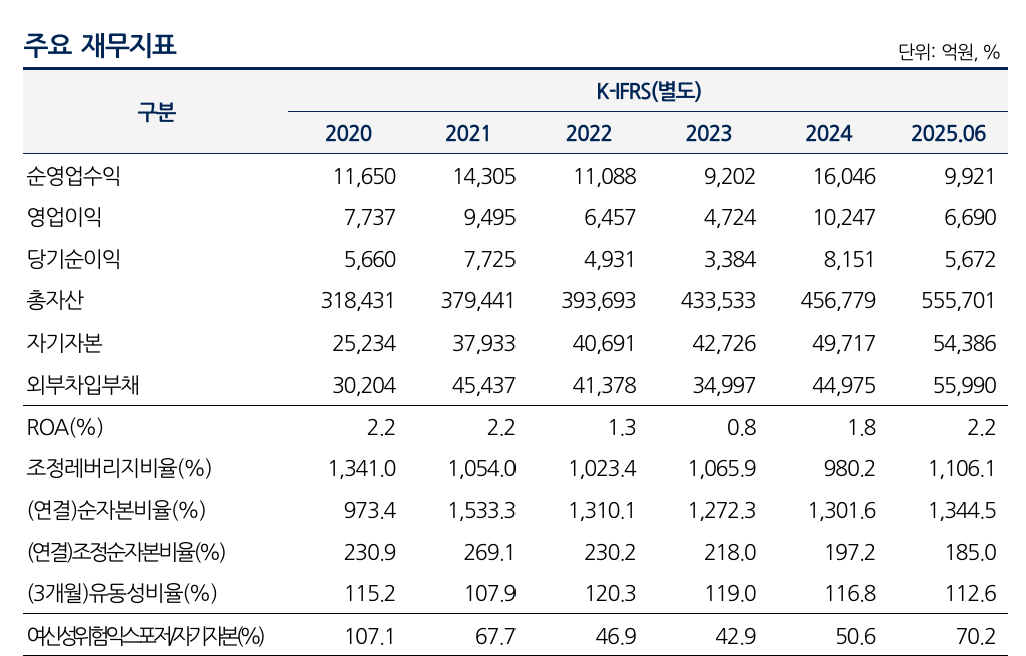 다만 부동산 익스포저 증가는 부담이다. IB부문 확대 과정에서 채무보증·대출·펀드 등 부동산 익스포저는 증가했다. 2023년 말 1조7000억원에서 지난해 말 2조2000억원, 올해 6월 말 3조5000억원으로 증가했다. 담보인정비율(LTV)·지역·시공사 등을 고려한 리스크관리를 통해 선별적으로 신규 부동산 딜을 수주하는 가운데 향후 위협자산 증가 추이와 건전성 저하 위험을 지켜볼 필요가 있다는 평가다.