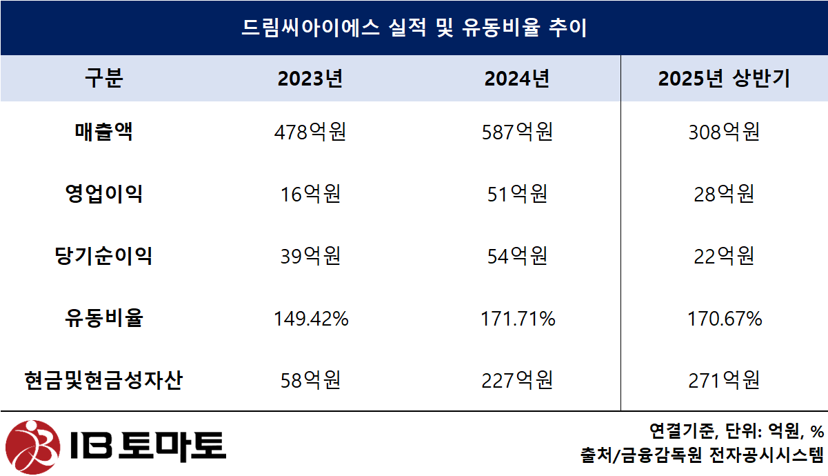 이처럼 공격적인 투자는 실적 성장세와 풍부한 유동성이 뒷받침을 하고 있다. 회사 매출은 2023년 478억원, 2024년 587억원, 2025년 상반기 308억원 등 외형성장을 지속하고 있으며, 영업실적 흑자를 유지 중이다. 올해 반기 말 유동비율은 170.67%를 기록했으며, 보유 현금및현금성자산은 271억원으로 집계됐다.