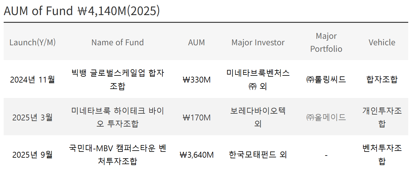 운용 중인 펀드로는 지난해 11월 결성한 빅뱅 글로벌스케일업 합자조합이 대표적이다. 규모는 3억원으로 해당 펀드로 롤링씨드에 투자했다. 이 밖에 1억7000만원 규모의 미네타브룩 하이테크 바이오 투자조합이 있다. 개인투자조합 형태로 올메이드에 투자한 바 있다.