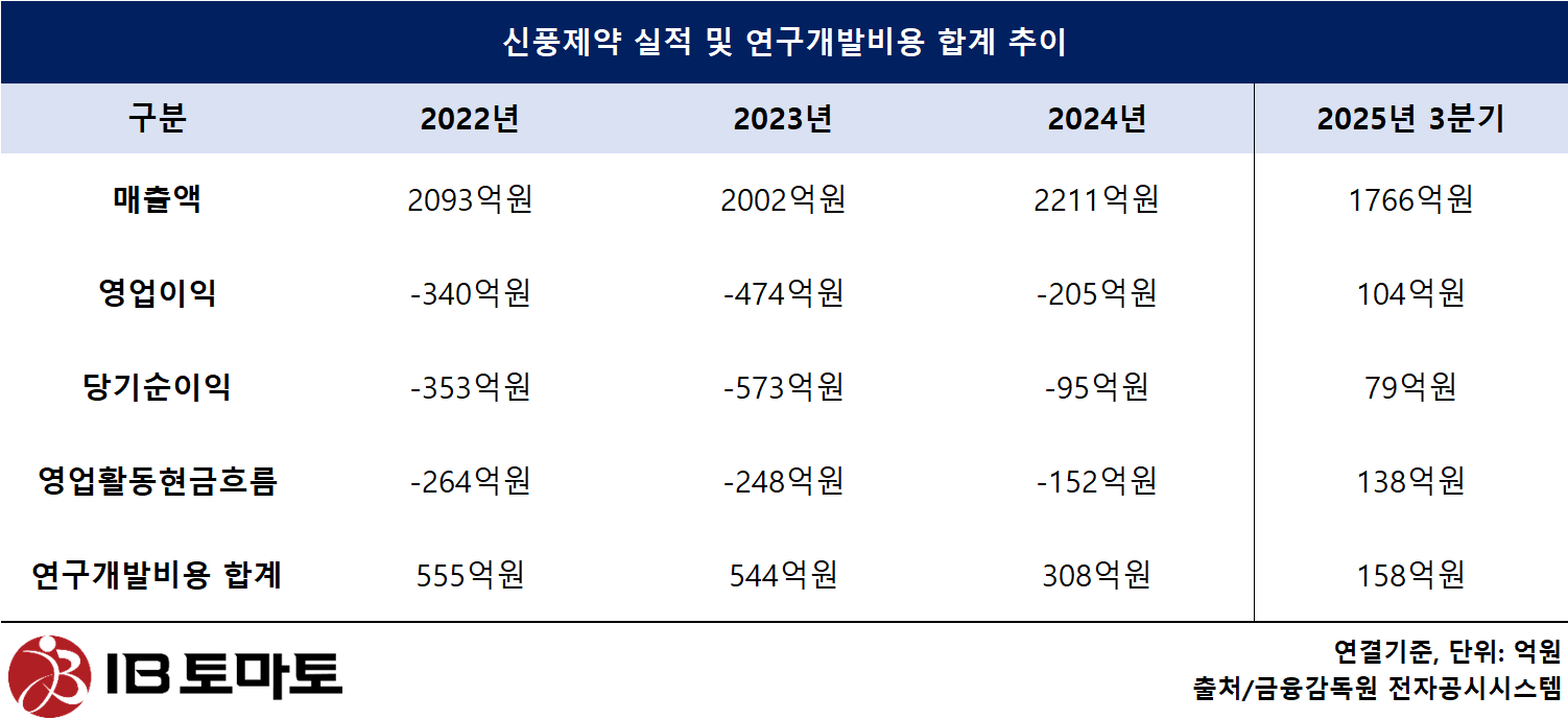 그러다 2024년 임상 완료 이후 연구개발비용 합계는 완연한 감소세로 접어들기 시작했다. 지난해 연구개발비는 308억원으로 집계되며 전체 매출 대비 13.92%까지 줄었고, 올해 3분기 누적 투입비용은 158억원으로 매출의 8.94%에 그쳤다.