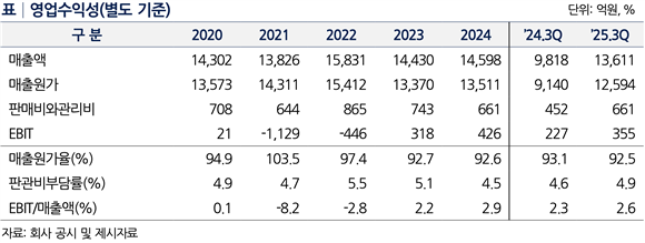 동시에 꾸준한 자본 확충도 병행 중이다. 2023년 1500억원의 추가 유상증자로 한 번 더 자본 확충에 나섰고, 이어 지난해 그룹사 세아상역의 지원 하에 영구채(500억원)도 발행했다. 이에 지난 2022년 753%에 달했던 부채비율은 올해 3분기 169.7%로 안정 범위에 진입했다. 같은 시기 차입금의존도는 16.6%에서 6.2%로 10%포인트가량 감소했다. 반면 현금성 자산은 2000억원 수준이라 차입금 대비 유동성 수준도 우수하다.