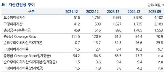 특히 요주의이하자산이 지난해 말 3970억원에서 올해 9월 4102억원으로 증가해 고정이하로 분류될 가능성이 있는 데다, 고정이하자산 대비 충당금 적립률이 여전히 100%를 하회해 추가적인 적립 가능성도 있다.