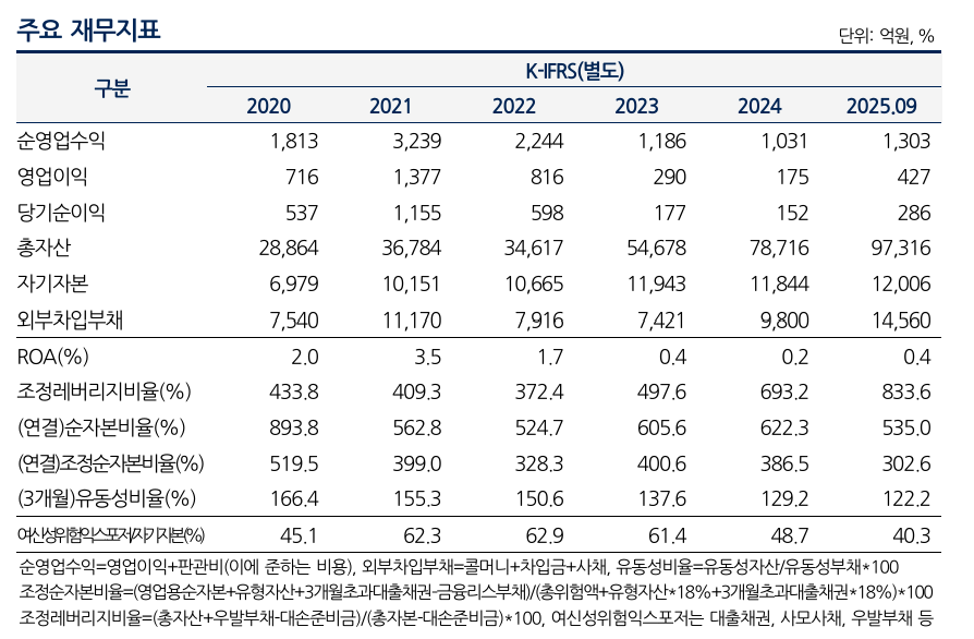 하지만 2022년 이후엔 주식 거래량 감소·경쟁심화에 따라 위탁매매부문 위축·부동산 시장 침체가 발생하고, IB 부문 수익성이 저하되고 대손비용이 증가했다고 보고서는 분석했다. 실제로 지난해 IB부문 수수료수익 감소와 대손비용 확대에 따라 2~3분기 연속 분기 적자를 기록했다. 지난해 연간 순이익은 전년 동기 대비 14.1% 감소한 152억원을 기록했다. 총자산수익률(ROA)도 0.2%를 기록하며 2023년 기준치(0.4%) 대비 낮았다. 올해 BNK투자증권의 대손 부담이 완화되며 1~9월 ROA 0.4%를 기록하는 등 전년 동기 기준치(0.1%) 대비 수익성이 개선된 부분은 고무적이다.