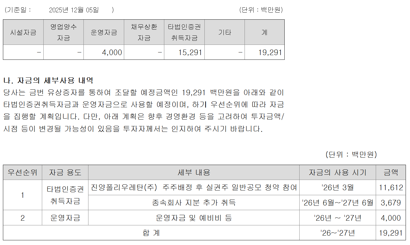이번에 유증으로 조달하는 자금의 약 80%에 달하는 153억원은 타법인증권 취득자금으로 사용될 예정이다. 우선 진양홀딩스는 종속회사 진양폴리우레탄을 대상으로 116억원 규모의 주주배정 후 실권주 일반공모 구주주 청약에 참여할 계획이다.