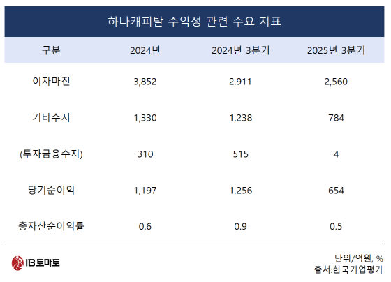 10일 여신전문금융 업계에 따르면 하나캐피탈은 3분기 기타수지 실적으로 784억원을 기록했다. 지난해 같은 기간 1238억원 대비 36.7%(454억원) 감소했다. 기타수지는 여신금융 본업에서 얻는 이자마진을 제외한 수익이다.