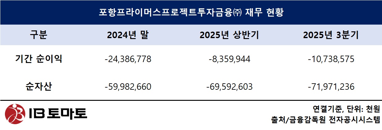10일 금융감독원 전자공시시스템에 따르면 포항역 복합개발 시행사(SPC)인 포항프라이머스프로젝트투자금융㈜(포항PFV, 신세계건설 지분 95%)는 이미 완전 자본잠식 상태에서 적자가 계속 누적되고 있는 것으로 나타났다. 지난 2024년 말 순자산이 –599억원이었던 데 이어 2025년 상반기 –695억원, 3분기에는 –719억원까지 결손폭이 확대됐다. 손익 흐름도 개선 조짐이 없는 모습이다. 올해 상반기 –83억원의 순손실이 발생한 데 이어, 3분기에도 –107억원의 적자가 이어졌다. 실질적인 매출 없이 금융비용만 쌓이는 구조가 반복되고 있는 것이다.