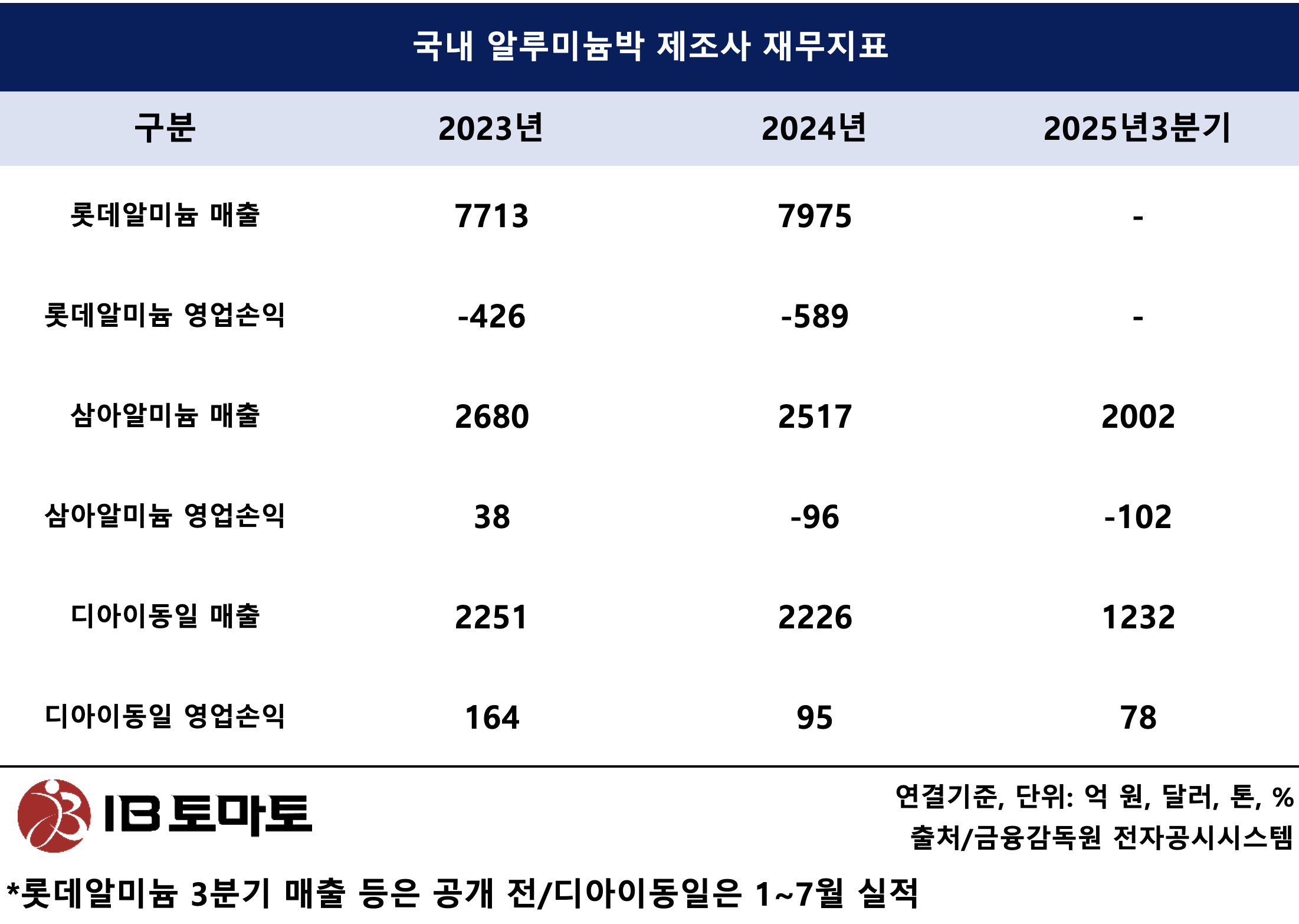 삼아알미늄은 올해 3분기 영업손실은 102억원으로 지난해 3분기(53억원 적자) 대비 적자 폭이 2배가량 커졌다. 비상장사인 롯데알미늄은 지난해 적자 589억을 내며 직전연도(426억원 적자)보다 적자 폭을 더 키웠다. 롯데알미늄의 올해 1분기 영업손실(70억원)이 지난해(79억원)에서 소폭 개선된 것으로 파악된다. 다만, 전방산업의 업황 악화 등을 고려했을 때 올해도 부진한 성적이 나올 가능성에 무게가 실린다. 그나마 디아이동일이 올해 1~7월 당기순이익 78억원을 내며 선방한 것으로 파악된다.