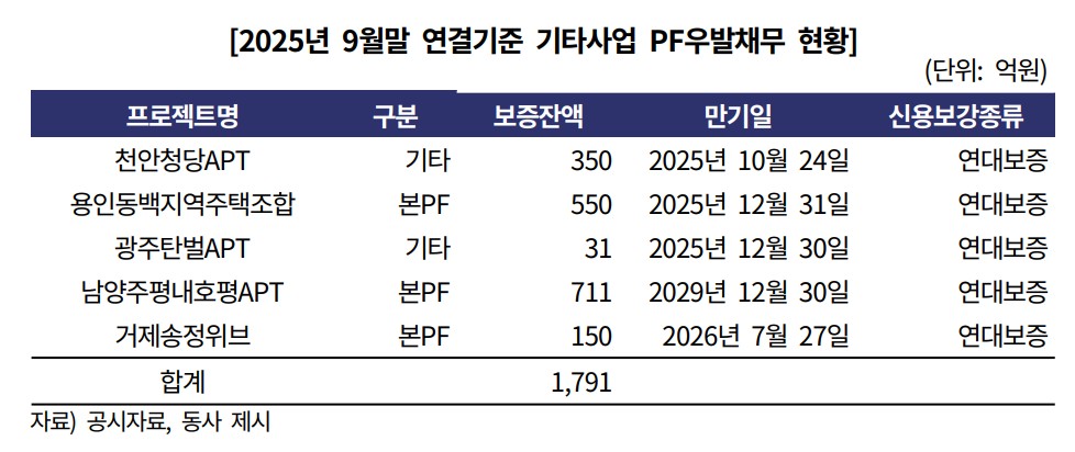 장기 지연 및 미매각 자산에 대한 대여 부담도 여전하다는 분석이다. 용인삼가는 2024년 분양 이후 성과가 양호해 추가 대여 규모는 제한적일 것으로 보이나, 천안청당은 지난해 10월 본 PF(프로젝트 파이낸싱) 전환 이후에도 초기 청약 성과가 저조해 2025년에만 413억원의 대여가 발생했다.