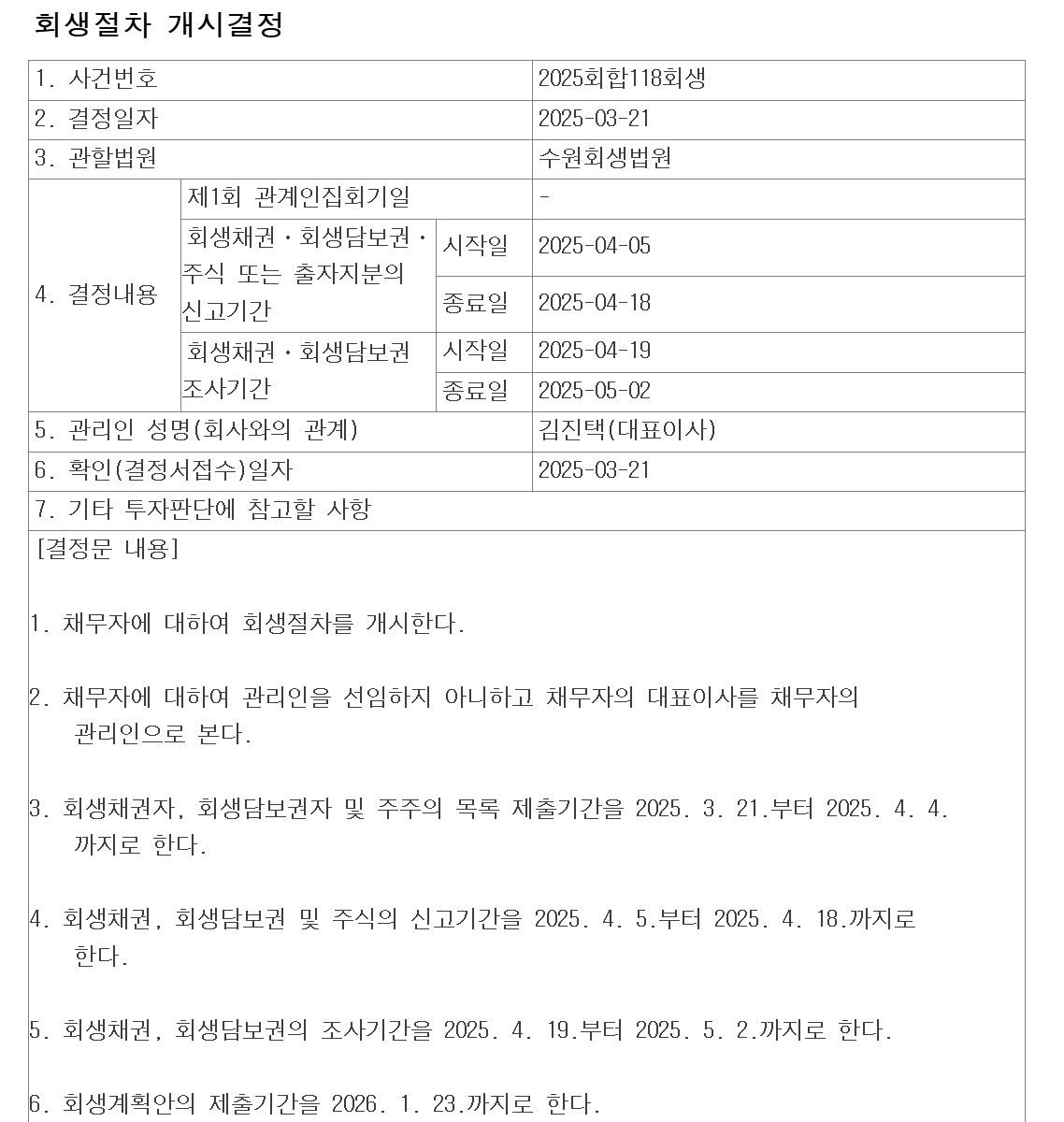 회생절차의 현재 단계가 공시에 명시되는 것도 같은 맥락이다. 회생절차는 신청, 개시결정, 회생계획안 제출 등 여러 단계를 거쳐 진행되며, 각 단계마다 회사의 법적 지위와 향후 가능성은 크게 달라진다. 따라 회생 관련 공시는 법원이 어떤 단계에 대해 어떤 판단을 내렸는지 구체적으로 밝혀준다.