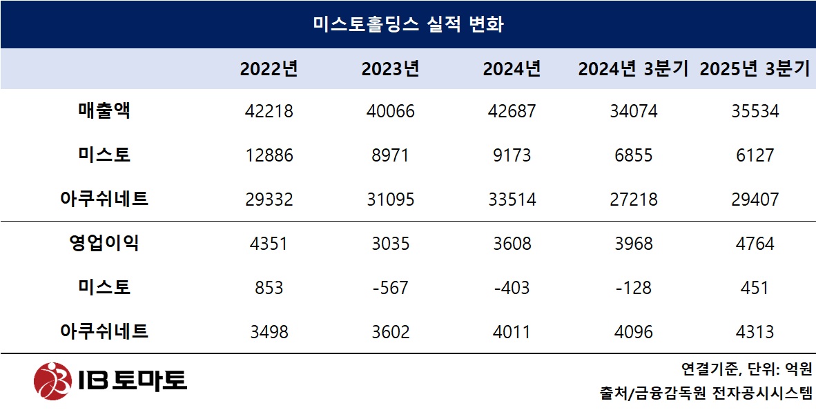 미스토홀딩스는 지난 2011년 미래에셋자산운용PE와 함께 1조4000억원에 아쿠쉬네트 경영권을 인수했다. 아쿠쉬네트는 최근 글로벌 골프 산업의 성장과 프리미엄 골프공 시장에서 경쟁력을 확보하며 지속적인 성장세를 보이고 있다. 이에 지난해 3분기 기준 매출기여도는 82.76%까지 늘었다. 연간으로 보면 지난 2022년 69.48%, 2023년 77.61%, 2024년 78.51%로 점진적으로 확대됐다.