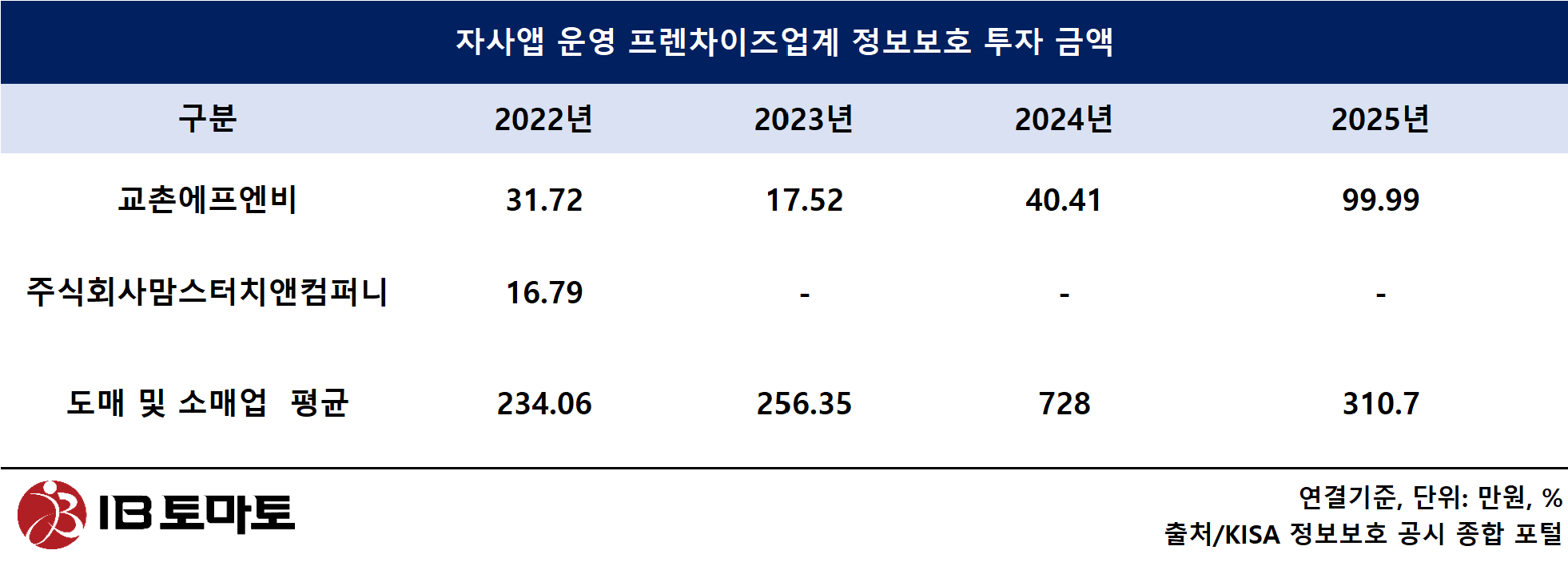 다만 교촌에프엔비는 정보보안 투자금액이 2022년부터 2025년까지 2023년을 제외하고 꾸준히 증가세를 보였다. 2022년 3억1720만원, 2023년 1억7520만원, 2024년 4억410만원, 지난해 9억9990만원 등이다.