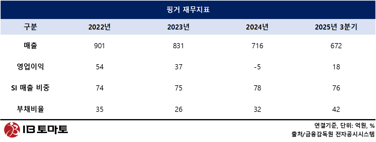 체질 전환을 뒷받침할 재무 여력도 충분하다. 3분기 기준 핑거의 유동비율은 285%로 단기 지급능력이 우수하다. 현금및현금성자산은 226억원으로 전체 유동자산의 54%를 차지하며 단기투자자산을 포함하면 약 292억원 규모의 유동성을 확보하고 있다. 부채비율은 42%, 순차입금비율은 0%로 무차입 경영 상태를 유지 중이다. 향후 SaaS 인프라 확장과 신규 사업 투자에서 단기적으로 재무 부담이 커질 가능성은 제한적일 것으로 분석된다.