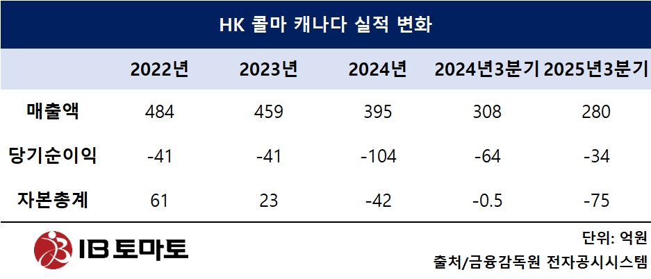22일 금융감독원 전자공시시스템에 따르면 HK 콜마 캐나다는 지난해 3분기 매출액 280억원을 기록했다. 이는 직전년도 동기(308억원) 대비 9.09% 감소한 수치다. 동기간 당기순손실은 64억원에서 34억원으로 손실 규모가 개선됐지만 여전히 적자를 기록했다.