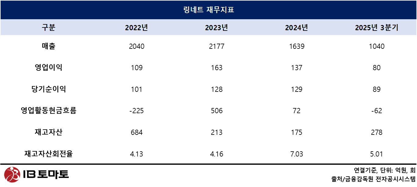 실적 둔화 국면에서 재고자산이 급격히 늘어난 점은 향후 실적 흐름과 함께 부담 요인이 될 수도 있다. 링네트의 재고자산은 2024년 말 175억원에서 지난해 3분기 278억원으로 58% 늘었다. 같은 기간 재고자산 회전율은 7.03회에서 5.01회로 낮아졌다. 영업활동현금흐름은 -62억원으로 마이너스 전환된 것도 현금흐름표상 재고자산 증가액 110억원에 의한 영향이 가장 컸다. IT 장비 유통업 특성상 기술 트렌드 변화에 따른 재고 진부화 위험이 있어 재고자산 증가세는 리스크가 될 수 있어 재고 관리는 여전히 중요한 변수다.