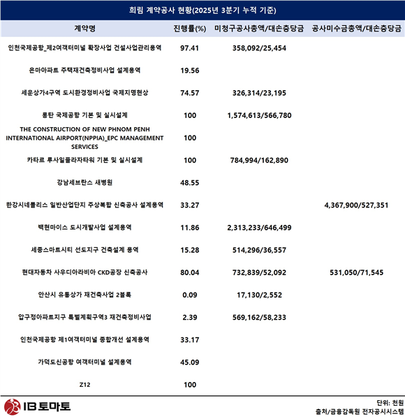 K-IFRS(한국채택국제회계기준) 기준상 공정률에 따라 매출과 미청구공사(계약자산)는 지속적으로 인식되지만, 실제 청구와 현금 유입은 특정 마일스톤(단계별 지급조건) 이후에 이뤄지는 경우가 많아 미청구공사가 구조적으로 누적되기 쉽다. 희림이 준공 이후까지 이어질 수 있는 정산 지연과 클레임 가능성을 감안해, 매출 인식과 대금 회수 시점 사이의 불일치를 대손충당금으로 관리하고 있다는 해석이다.