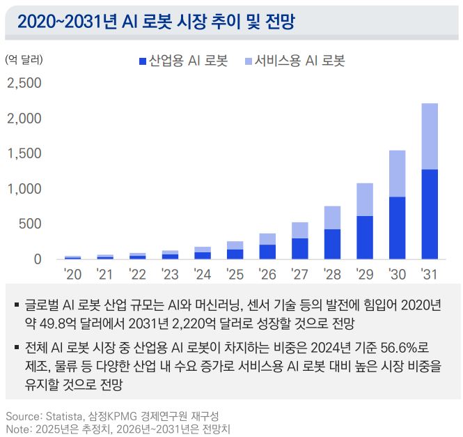 삼정KPMG는 데이터베이스 플랫폼 스태티스티아 자료를 기반으로 글로벌 AI 로봇 산업 규모는 2020년 49.8억달러에서 2031년 2220억달러로 40배 이상 성장할 것으로 내다봤다. 특히 전체 AI 로봇 시장 중 산업용 AI 로봇이 차지하는 비중은 2024년 기준 56.6%로 제조, 물류 등 다양한 산업 내 수요 증가로 서비스용 AI 로봇 대비 높은 시장 비중을 유지할 것으로 보인다.
