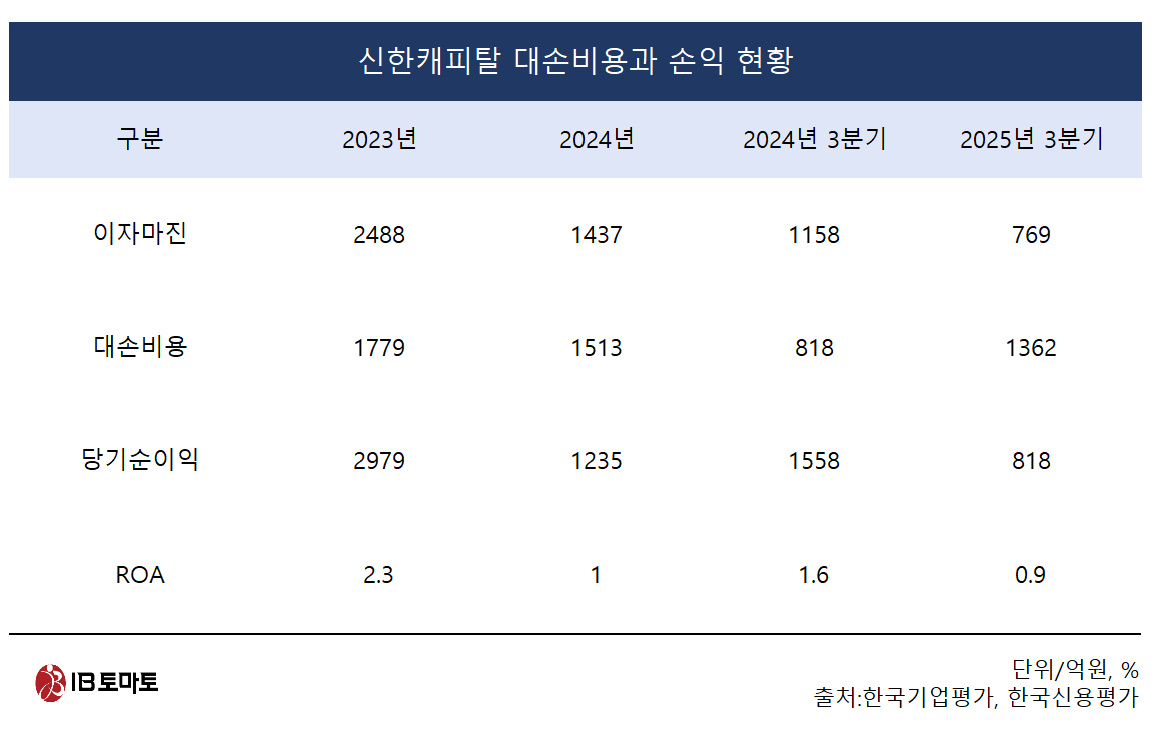 여신전문금융 관련 한 연구원은 <IB토마토>에 "신한캐피탈은 2024년 전에는 부동산PF 익스포저가 자기자본 대비 100%를 넘어설 정도로 과도한 곳이었다"라면서 "그동안 PF 자산을 축소해 왔지만, 그간의 대손비용 확대나 ROA 하락은 그 후유증"이라고 설명했다.
