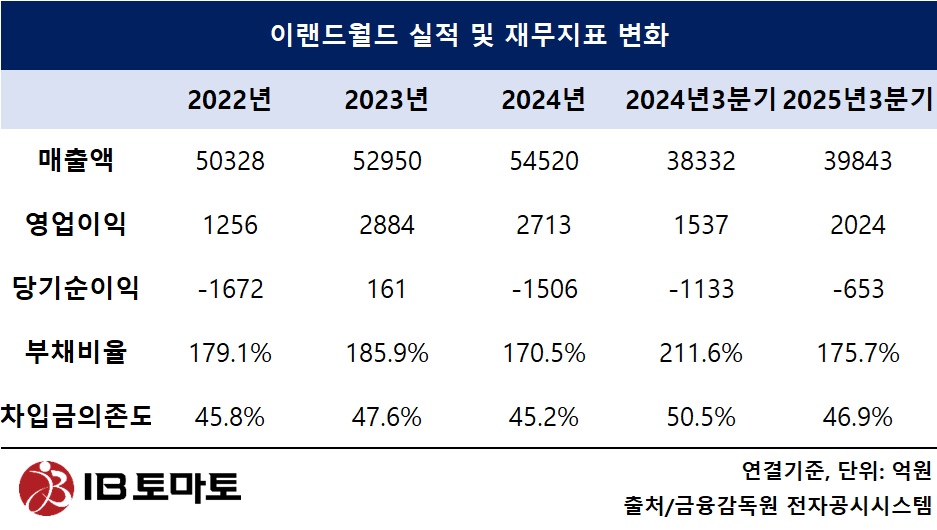 이랜드월드 관계자는 <IB토마토>와 인터뷰에서 "상각전영업이익(EBITDA)이 지속적으로 증가하고 있고, 최근 비경상적인 대형투자를 완료했다"라면서 "차입금의 부담은 수익성 위주의 선별적 투자와 차입금리 절감, 비영업자산 매각을 통해 축소해 나갈 계획"이라고 말했다.